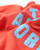 A NEW MODEL, very junior minded and hip. A high mockneck for cold winter days, puffed sleeves and an oversized body. All this and more ! The art work was made out of all these little colored sequins, that immediately gives the sweater that little extra extra on top! Plus it's made out of 100% high quality RECYCLED cotton. How cool is that! Available in two catchy colour combos, one with soft blue and one with fluo green.