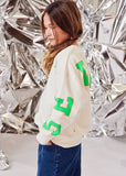 Cool sleeve and back print on this pretty sweater : a real stand-out piece, please!