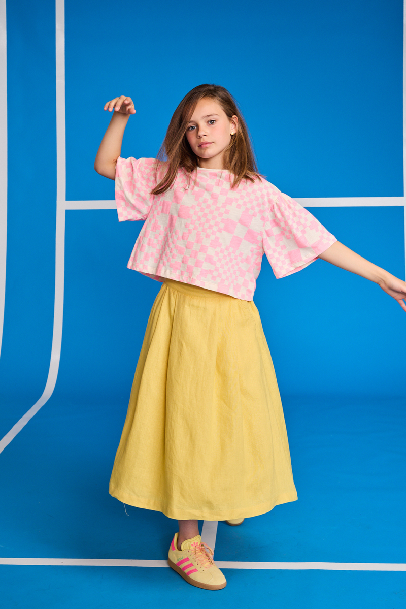 A cropped top with a playful checked pattern brings lightness and movement, paired with a flowing skirt in a warm, sunny tone. Easy to wear, full of character and made to move freely. A look that feels relaxed, expressive and quietly confident.