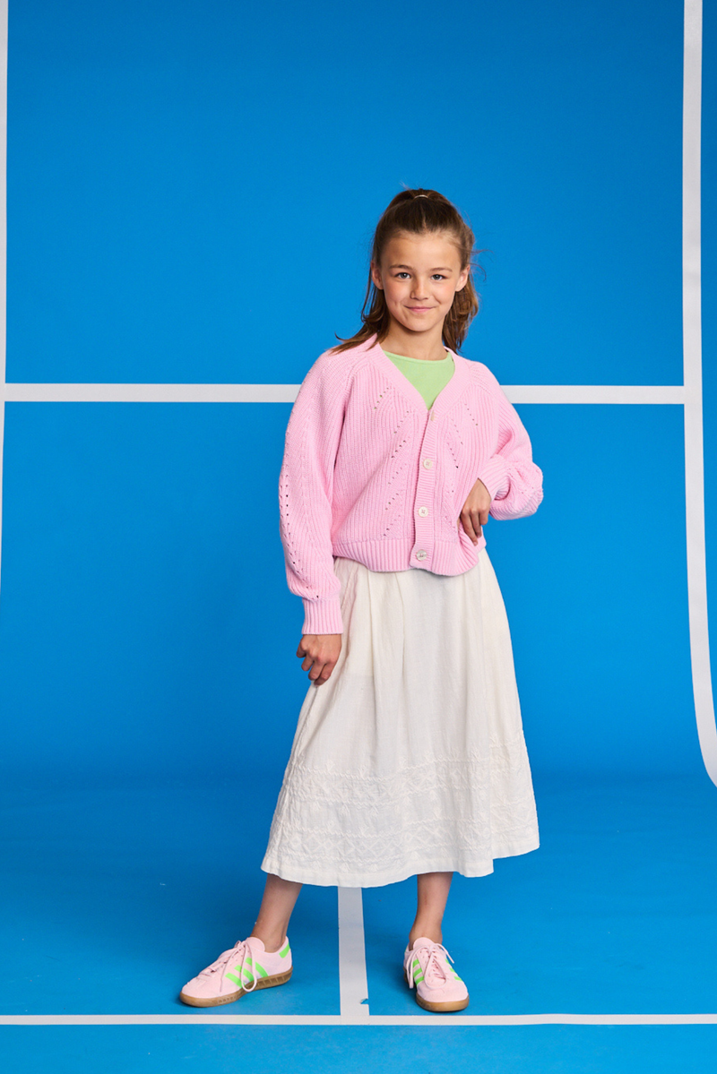 A soft pink cardigan adds warmth and texture to a light, flowing skirt. Relaxed and comfortable, with a fresh colour contrast that feels easy and playful for everyday wear.