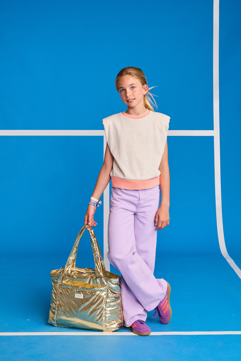 A soft sleeveless knit with subtle contrast details, paired with relaxed lilac trousers for an easy pop of colour. Finished with playful accessories that keep it light and effortless. Comfortable, confident and made for moving through the day.