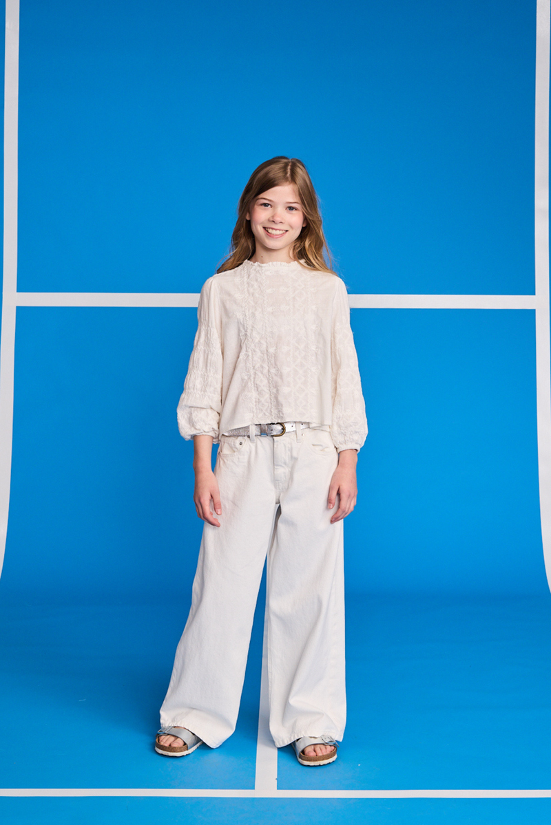 A textured blouse paired with wide white denim feels effortless and timeless. Soft, comfortable and easy to wear, a clean look that lets simplicity do the talking.